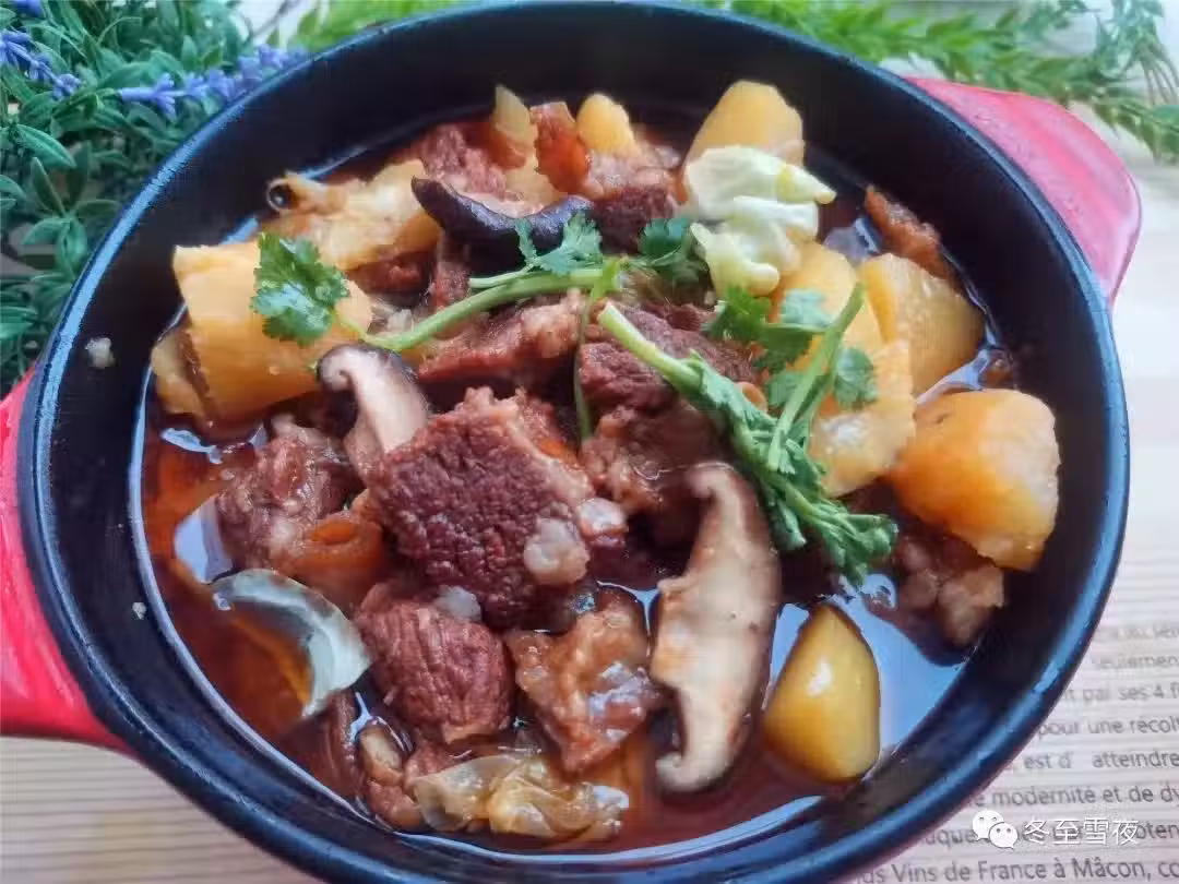 【家常筋頭巴腦鍋】所需材料:牛筋頭巴腦2斤、土豆2個、包菜半棵、香菇半斤、油鹽適量、蔥1段、姜1塊、花椒十幾粒、大料2個、干辣椒2-3個、料酒1湯匙、番茄醬2湯匙、海鮮醬油2湯匙、白鬍椒粉1茶匙、