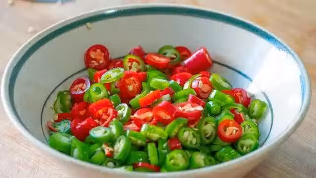 6、這時候來切點配菜,青紅辣椒各準備一把,清洗乾淨後切圈備用。青紅辣椒我用的杭椒,個人覺得並不是特別辣,能吃辣的可以用小米椒代替,一點點辣都不能吃的可以用菜椒代替。