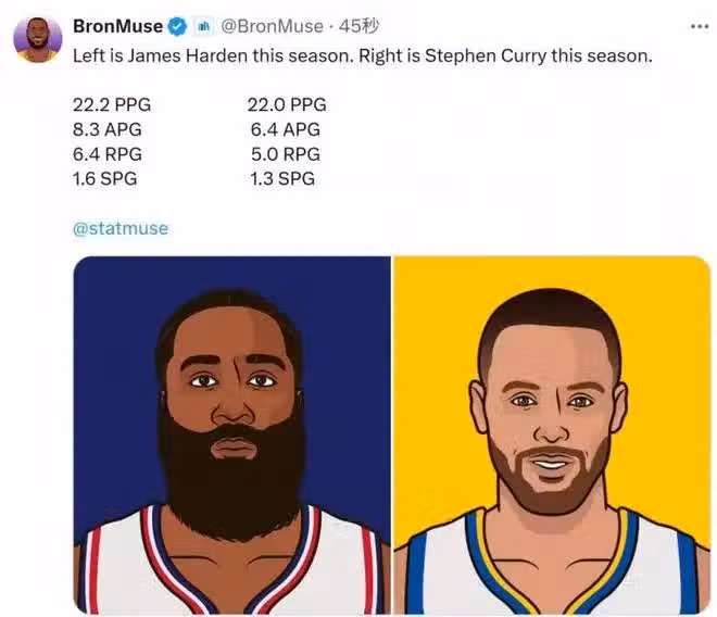 有這樣的一項數據證明了這些,本賽季哈登已經被認為是大幅度下滑了,但是場均數據仍然有22.2分6.4籃板8.3助攻1.6搶斷,投籃命中率是39.2%、三分命中率是35.4%,這是哈登的數據,而另外一邊的庫里呢?庫里這個賽季數據卻只有場均22分5籃板6.4助攻了,投籃命中率是44.3%、三分命中率是40.9%。