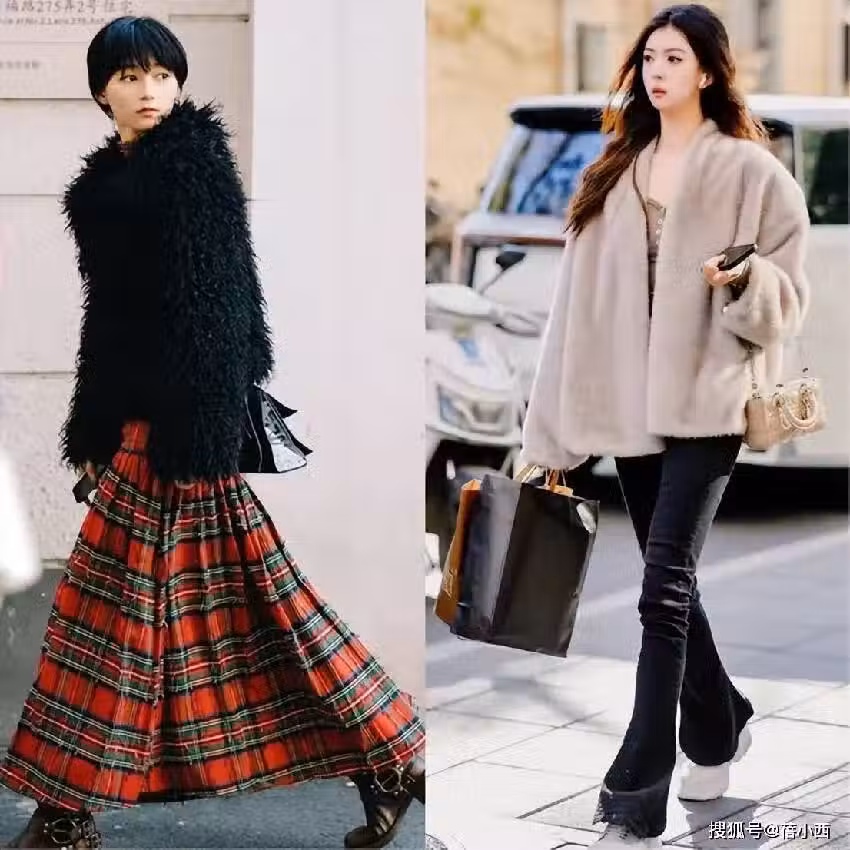 另外也可以在穿這種毛絨絨外套時利用個性的混搭,上半身穿純色的毛絨外套也許有單調感,推薦在下半身配合這種帶有一定元素的時尚服裝,就比如這種格紋的裙子,更加能夠突出個性風格。