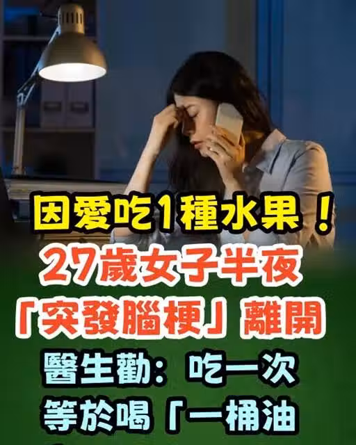 因愛吃1種水果 !27歲女子半夜「突發腦梗」離開 醫生勸:吃一次等於喝「 一桶油!」