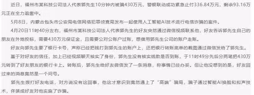 2023年5月,福州一位公司法人代表郭先生,就遭遇了一場精心策劃的AI詐騙。他接到了一位「朋友」的微信視訊電話,對方不僅容貌與聲音都和他的朋友一模一樣,甚至還展示了所謂的競標現場。郭先生信以為真,將430萬元轉入對方提供的帳戶,短短10分鐘內就損失慘重。事後才發現,這通視訊電話完全是騙子利用AI技術偽造的。
