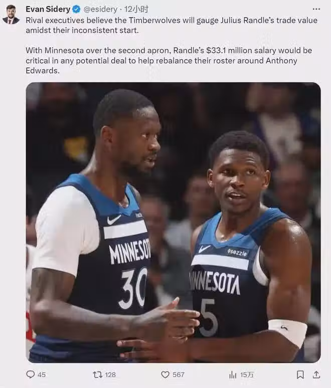 今年9月28日,森林狼剛剛交易得到蘭德爾。如今不到3個月,森林狼就要將其拋棄,這不是打自己的臉嗎?球隊也沒辦法,蘭德爾跟愛德華茲很難共存。目前森林狼14勝14負,僅排名西部第10。別忘了,上賽季森林狼可是西部第3!