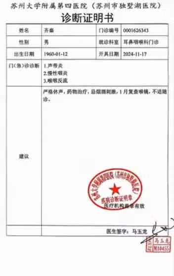 根據《ETtoday》報導,情歌天王齊秦上個月16日在蘇州登台獻唱,現場觀眾發現他表現不如往常,不僅發福嚴重、膚色轉深黑,演唱時更顯得沙啞、氣力不繼,頻頻唱一句停一句,遇到高音段落竟舉起麥克風請台下觀眾幫忙合唱,讓歌迷失望不已,同月24日預計參加平陽的群星演唱會,也突然公布聲帶發炎臨時缺席,不料這卻是健康亮紅燈的徵兆。