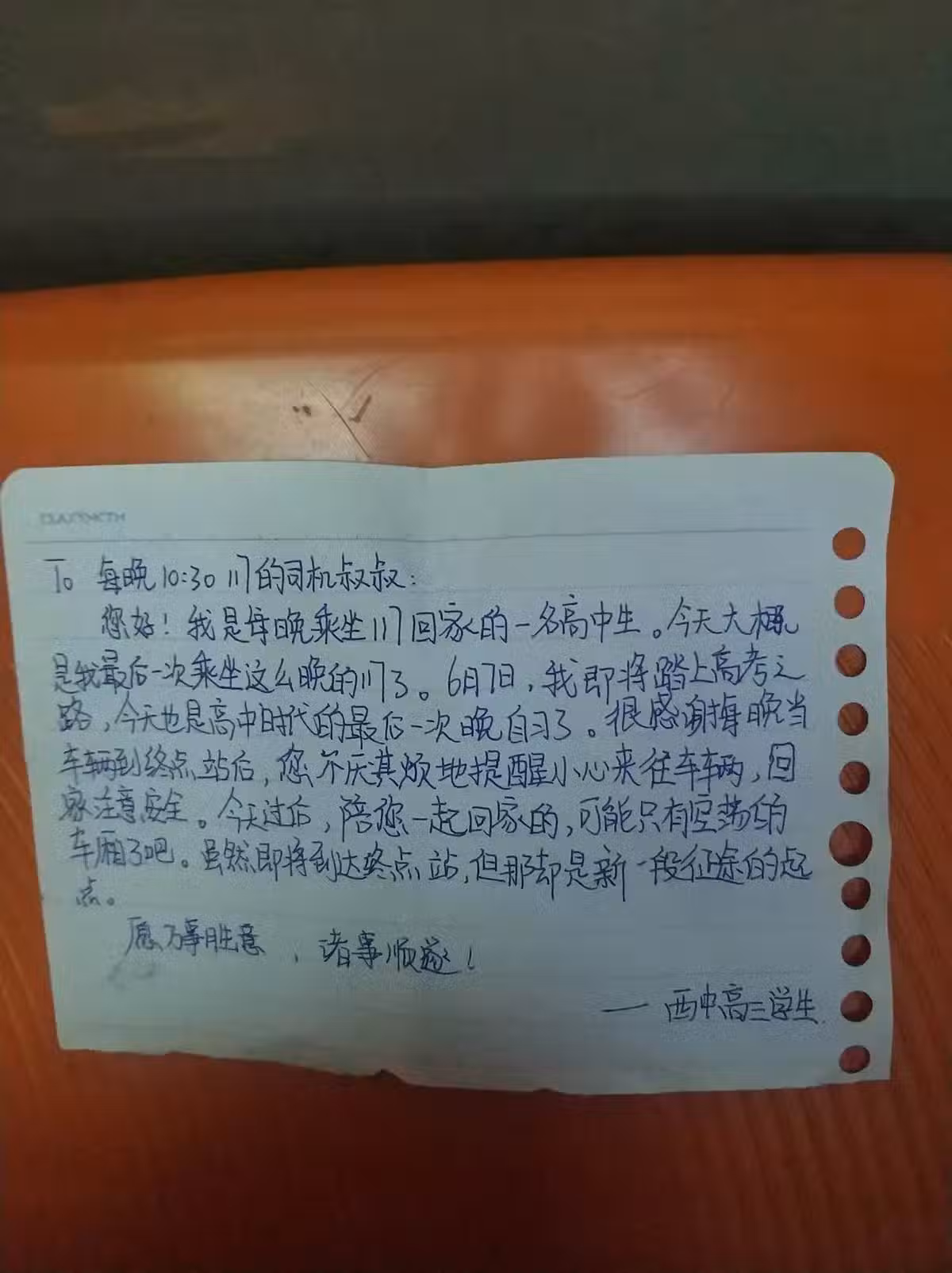 「6月7日,我即將踏上聯考之路,今天也是高中時代的最後一次晚自習了。很感謝每晚當車輛到終點站後,您不厭其煩地提醒小心來往車輛,回家注意安全。今天過後,陪您一起回家的,可能只有空蕩的車廂了吧。雖然即將到達終點站,但那卻是新一段征途的起點。願萬事勝意,諸事順遂!」紙條落款為「西中高三學生」。