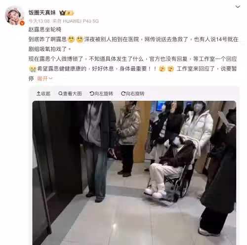趙露思在拍電視劇《戀人》時就多次傳出健康狀況不佳,甚至要吸純氧才能支撐意識。昨日微博上更流傳一系列趙露思坐輪椅到醫院的照片、影片,讓粉絲憂心不已。隨後,趙露思工作室微博回應,稱她為了拍戲付出巨大心力,目前為了健康著想,全面暫停工作,謹遵醫囑治療休養中。