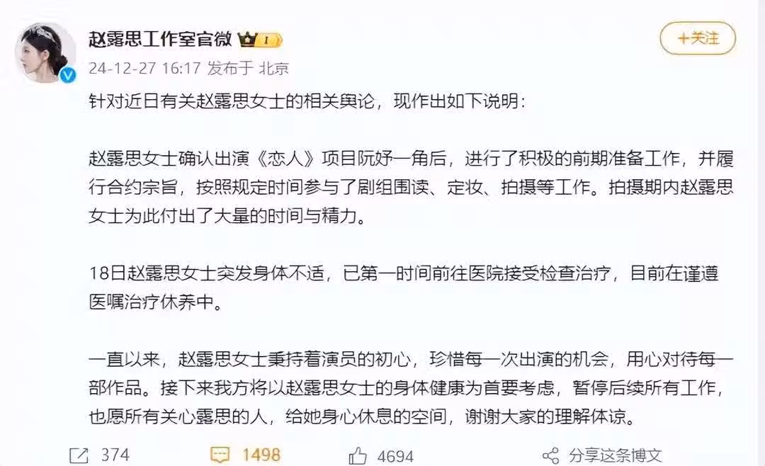 趙露思「已停工數日」,2000萬粉絲帳號關閉,「父親揭生病原因」早有預兆!