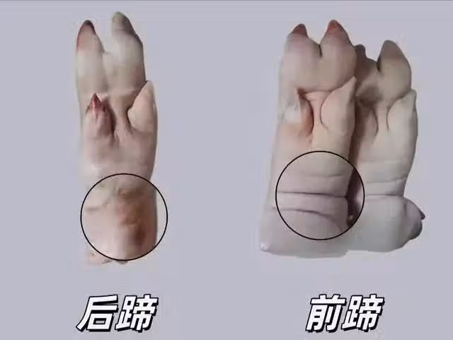 2、買豬蹄的時候要買前蹄,前蹄根部有褶皺筋多肉多,而後蹄根部滑溜溜的筋少肉少。