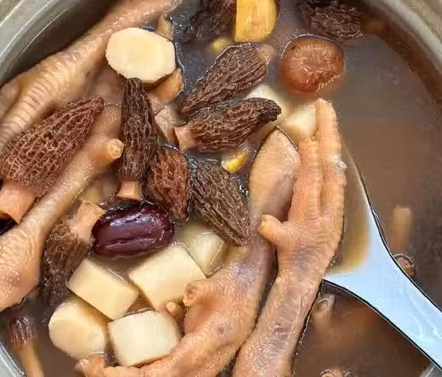 食材:雞腳8-10條、新鮮鐵棍山藥100克、板栗8-10個、百合15克、炒白扁豆10克、太子參8-10克、陳皮1瓣、羊肚菌一把、蜜棗1個、紅棗3個