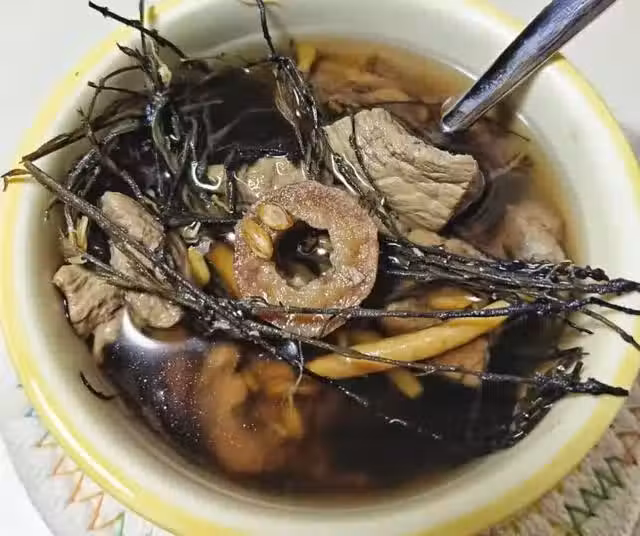 食材:豬展肉300克、獨腳金10克、太子參10克、炒麥芽15克、炒谷芽15克、椰棗2-3粒、山楂干5克(適合2-3人分量)