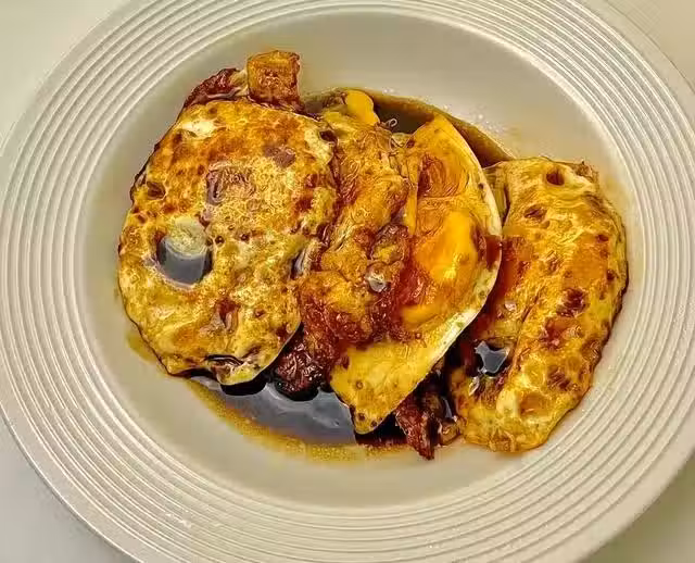 3、等糖醋汁開始有點粘稠了,放入煎好的荷包蛋。輕輕地用鍋鏟把雞蛋翻動一下,讓每個雞蛋都均勻地裹上糖醋汁。不要太用力翻動,以免蛋黃破掉。這樣翻個幾下,讓糖醋汁更好地吸附到蛋白上。