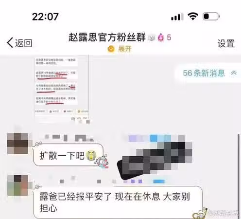 有不少網民事後在趙露思的粉絲團中分享趙爸爸回應截圖,已經替女兒發聲報平安,表示正在好好休養中,呼籲大家不必過於焦慮。