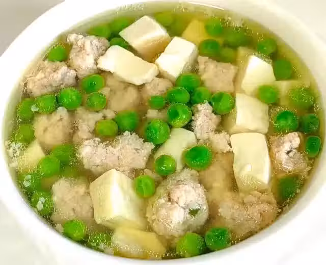 3、水燒至冒小氣泡的時候放入肉丸。肉丸煮熟時倒入豆腐、豌豆,煮大約五六分鐘加少許的鹽、香油即可。