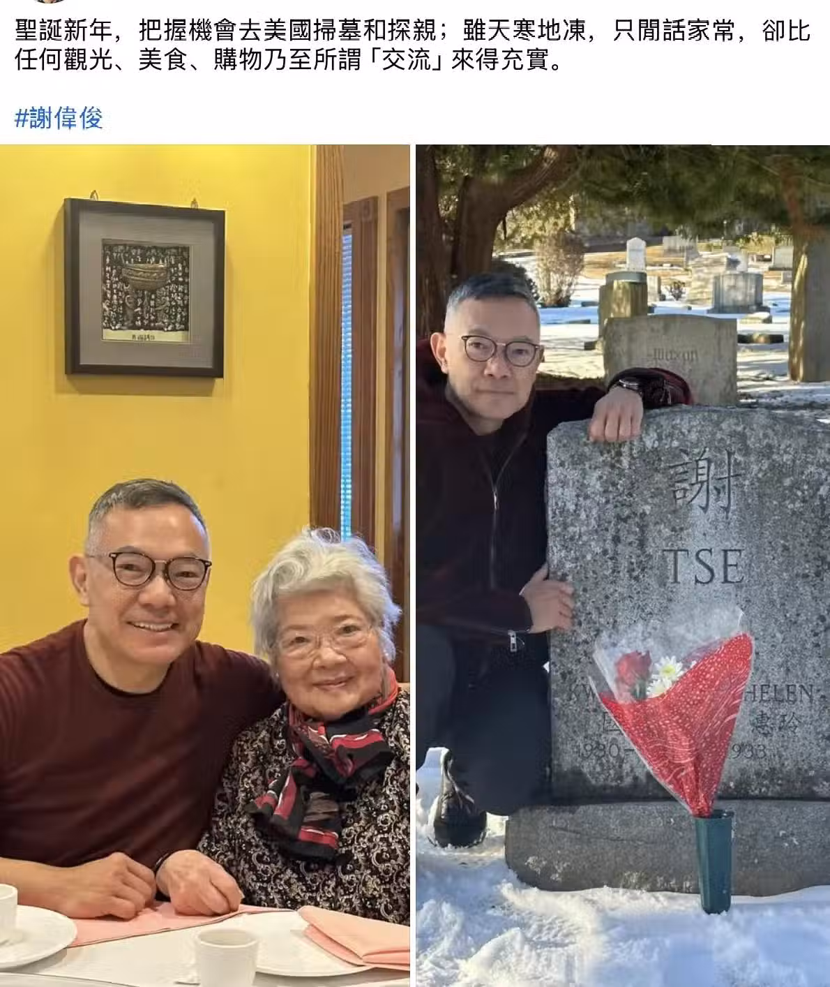 謝偉俊只曬出了兩張照片,合照中只有母子的身影,想必妻子白韻琴沒有同行,就算同行應該也不會合照。怎麼說呢,白韻琴已經年過80歲了,早就不是風韻猶存的白姐姐了,從這兩年被曝光的近照來看,她已經變成了白奶奶,縱然有時候打扮還是很隆重,卻也難掩老態。年事高不適合搭乘長途飛機是一方面,謝偉俊的家人所在之地天寒地凍,這麼寒冷的氣候,白韻琴應該也不想去感受。再者謝偉俊的母親與白韻琴的年齡相若,都是老太太,重點是謝媽媽狀態很好,看起來比白韻琴狀態更年輕,所以這種同框的場面多少會顯得尷尬吧。事實上這麼多年來,也從來沒聽白韻琴提起與婆婆的相處,就更不用說合照了。
