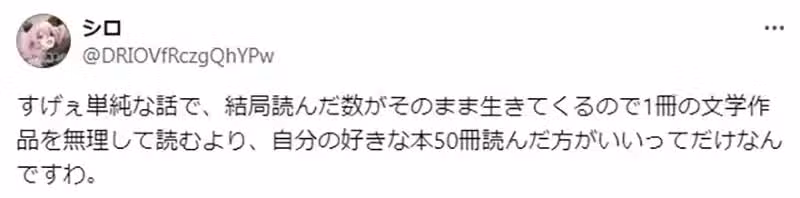 「1本跟50本來比的話,當然是後者比較會提升語文能力吧。如果你拿明治文學20本跟輕小說20本來比,我敢說就是前者了。」