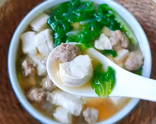 食材:瘦肉200克、青菜適量、嫩豆腐1塊、生薑3片、生抽1 勺、蚝油1 勺、鹽適量、雞精適量(