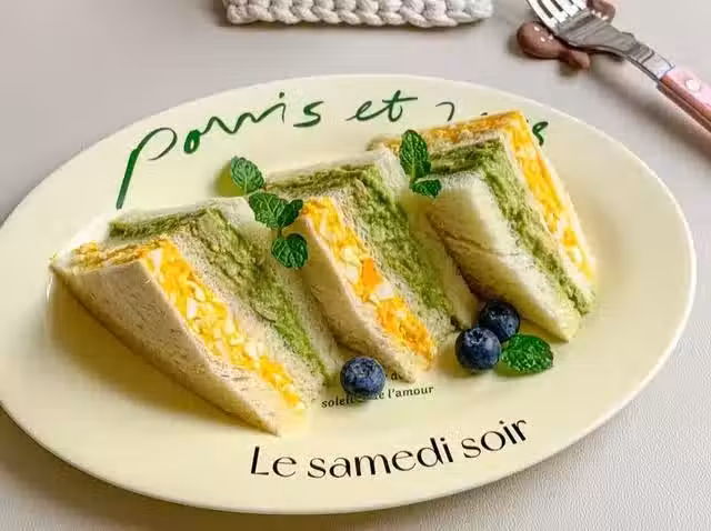 3、牛油果加入適量檸檬汁和黑胡椒海鹽攪拌均勻。雞蛋醬和牛油果泥分別抹在麵包上,然後依次疊起來呈對角線切開後擺盤即可。