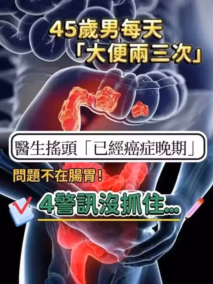 才45歲!他每天「大便兩三次」以為消化好,醫生搖頭「已經癌症晚期」,4個異常沒注意