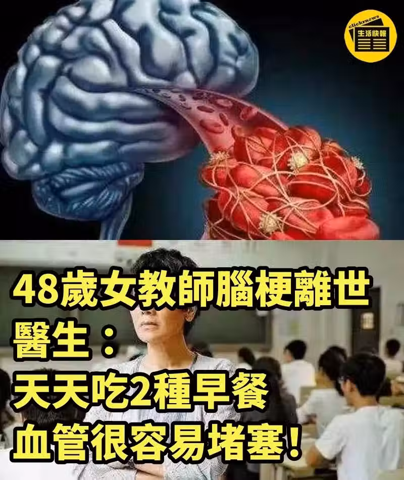 48歲女教師腦梗離世,醫生 :天天吃2種早餐 ,血管很容易堵塞❗