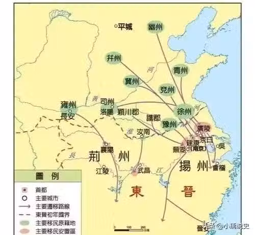 鮮卑、羯、氐、羌等少數民族紛紛內遷,中原地區陷入戰亂,一大批士族、官僚開始遷往比較安全的江南,史稱衣冠南渡。