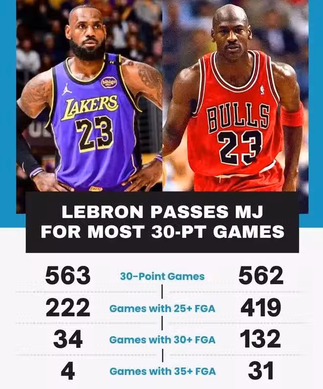 只能說,他們倆不是同一類型的球員,喬丹的定位就是超級得分手,他在NBA打了15個賽季,就拿過10次得分王。數據顯示,喬丹生涯場均出手22.9次,最高的一個賽季是27.8次。而詹姆斯的定位是一個全能球員,他只拿過1次得分王,數據顯示,詹姆斯生涯場均出手19.9次,最高的一個賽季是23.1次。