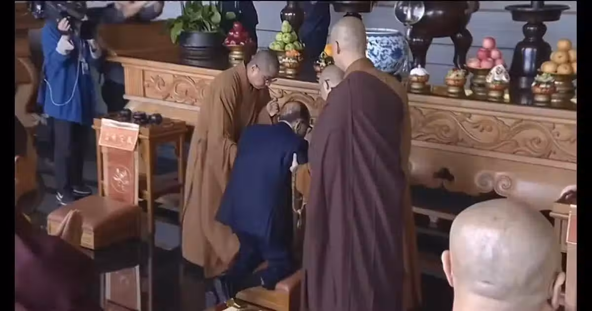 李嘉誠從外面走到佛堂時,很多僧人就上前扶他,他到佛堂準備下跪時,旁邊有幾位年輕的僧人全部都在攙扶他。