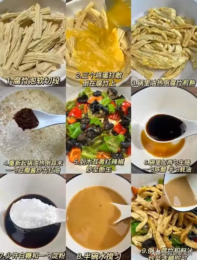做法:腐竹泡發切段,木耳泡發撕小朵,青椒切塊。