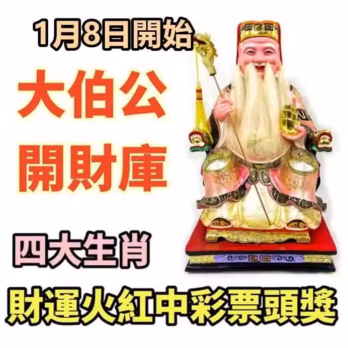 1月8日開始大伯公開財庫,四大生肖財運火紅中彩票頭獎。