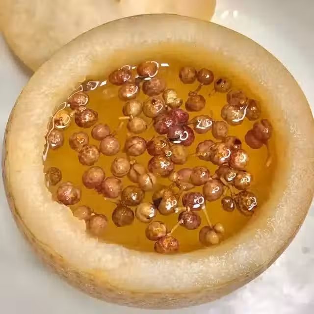 這個熱飲效果很不錯,喉嚨不舒服,有點咳,都可以做這個花椒蒸雪梨。寒熱咳都可以喝。