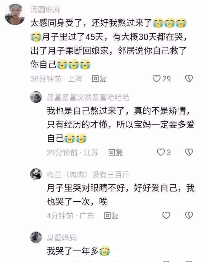 在該事件的評論區中,不少人表示,自己在生完孩子後,有明顯的產後抑鬱症狀。