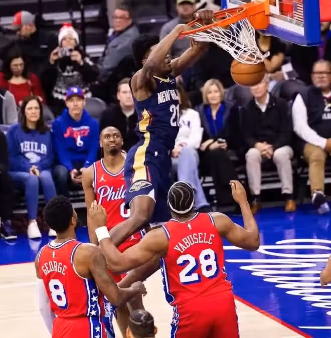 1月11日,76人坐鎮主場迎戰鵜鶘。一開場,麥科勒姆火力全開,單節獨砍18分,鵜鶘以4分領先結束首節; 次節鵜鶘上來保持了進攻狀態,他們一度將比分拉開到兩位數,關鍵時刻76人發起反撲,打出12-2小高潮反超比分,鵜鶘內外開花穩住局勢,半場結束時鵜鶘53-47領先76人;易邊再戰,雙方都提起節奏推快攻為主,不過鵜鶘這邊終結能力更勝一籌,最後阿爾瓦拉多的三分幫助鵜鶘取得9分領先進入末節;末節之爭鵜鶘牢牢控制著10分左右的優勢,76人進攻乏力只能繳械投降。最終,鵜鶘客場123-115擊敗76人拿下比賽。