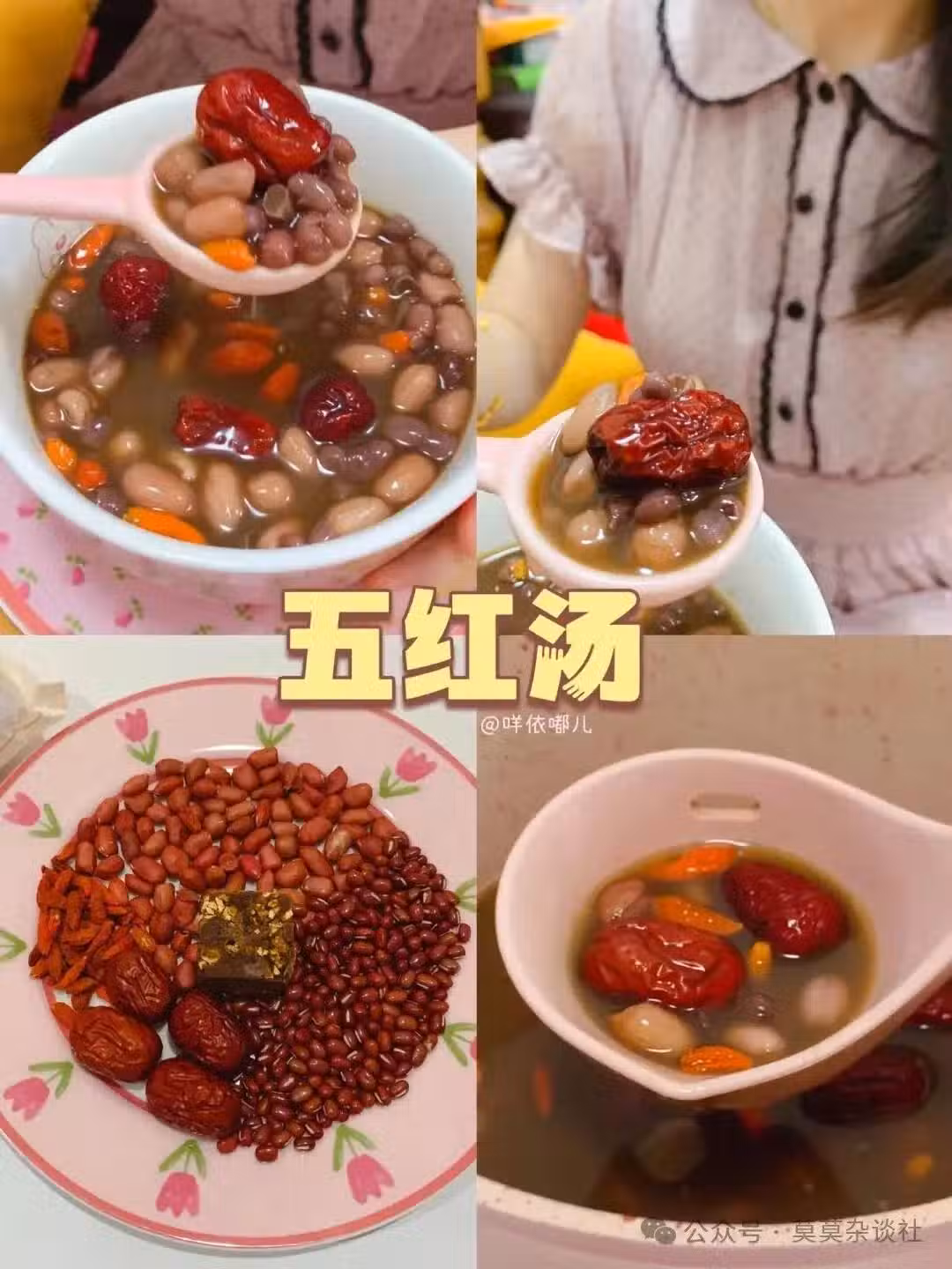 五紅湯是補氣血的經典方子,堪稱「女性的加油站」。 紅豆和紅花生富含鐵質,搭配紅棗、枸杞和紅糖,喝完後整個人都精神了起來,氣色也會更紅潤哦!