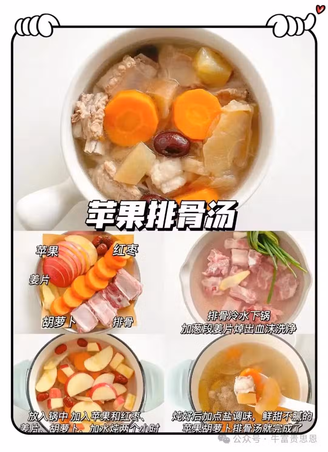 排骨500克切段,蘋果1個去核切塊,胡蘿蔔1根去皮切塊,紅棗5顆去核,山藥1段去皮切塊。