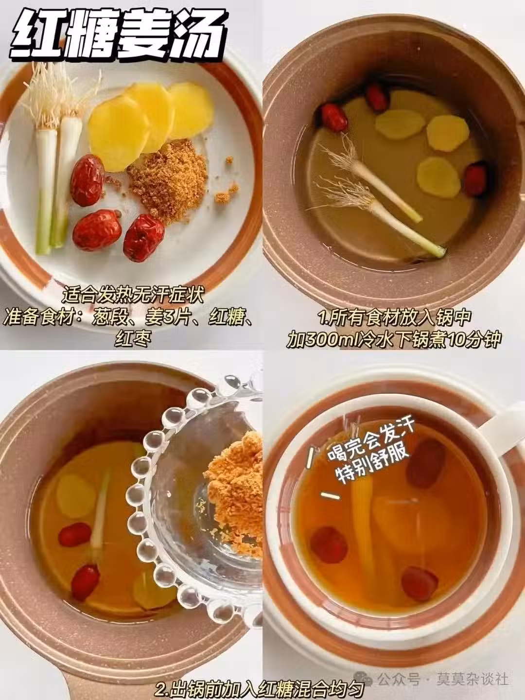 用料:蔥段3-5根 | 生薑3片 | 紅糖1勺 | 水500ml