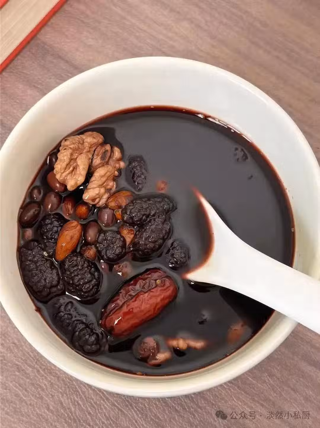 食材:黑豆100克、枸杞20克、核桃仁1個、桑葚10克、紅棗一顆 做法:黑豆提前泡發,與其他食材一起煮40分鐘左右,食材都可以吃。 核桃味甘,性溫,歸腎、肺、大腸經。它可以溫補腎陽,用於治療腎陽虛衰、腎虛腰膝酸痛、兩足痿弱、腎虧腰酸、小便頻數。此外,核桃長於補肺腎,定喘咳,常用於治療肺腎不足、腎不納氣所致的虛喘證。核桃仁還可以用於治療腸燥便秘。 桑葚適用於腎陰虛的病人,能夠起到很好的預防和治療的作用,因為毛髮確實和腎是有關係的,所以補腎它有烏髮的作用。