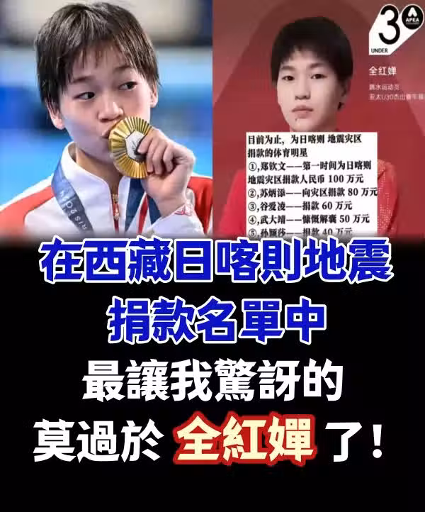 在西藏日喀則地震捐款名單中,最讓我驚訝的莫過於全紅嬋了!!