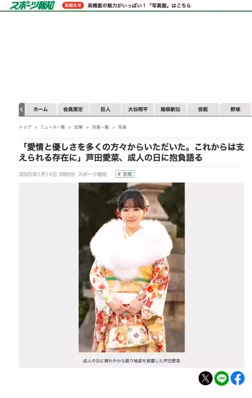 去年(2024)6月23日滿20歲的蘆田愛菜,穿著白底搭配花紋的振袖和服,從腰帶到領口的配飾,均由她親自挑選。蘆田愛菜感慨表示:「我衷心感謝一直以來溫暖守護著我的所有人。」