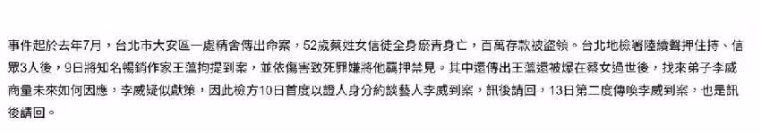 李威之所以捲入命案,是因為王薀在蔡姓女子死亡後,曾找李威商議如何應對,爆料稱,李威疑似獻策。