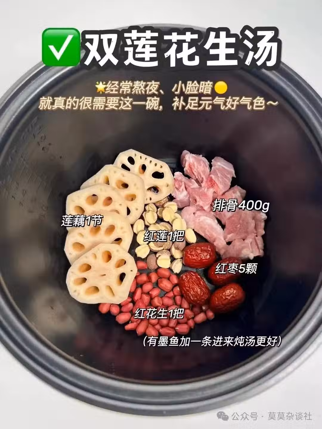 味道及功效:「雙蓮」指的是蓮藕和紅蓮子,搭配花生和紅棗,補氣養血、滋養脾胃,湯鮮香濃郁,特別適合日常滋補。