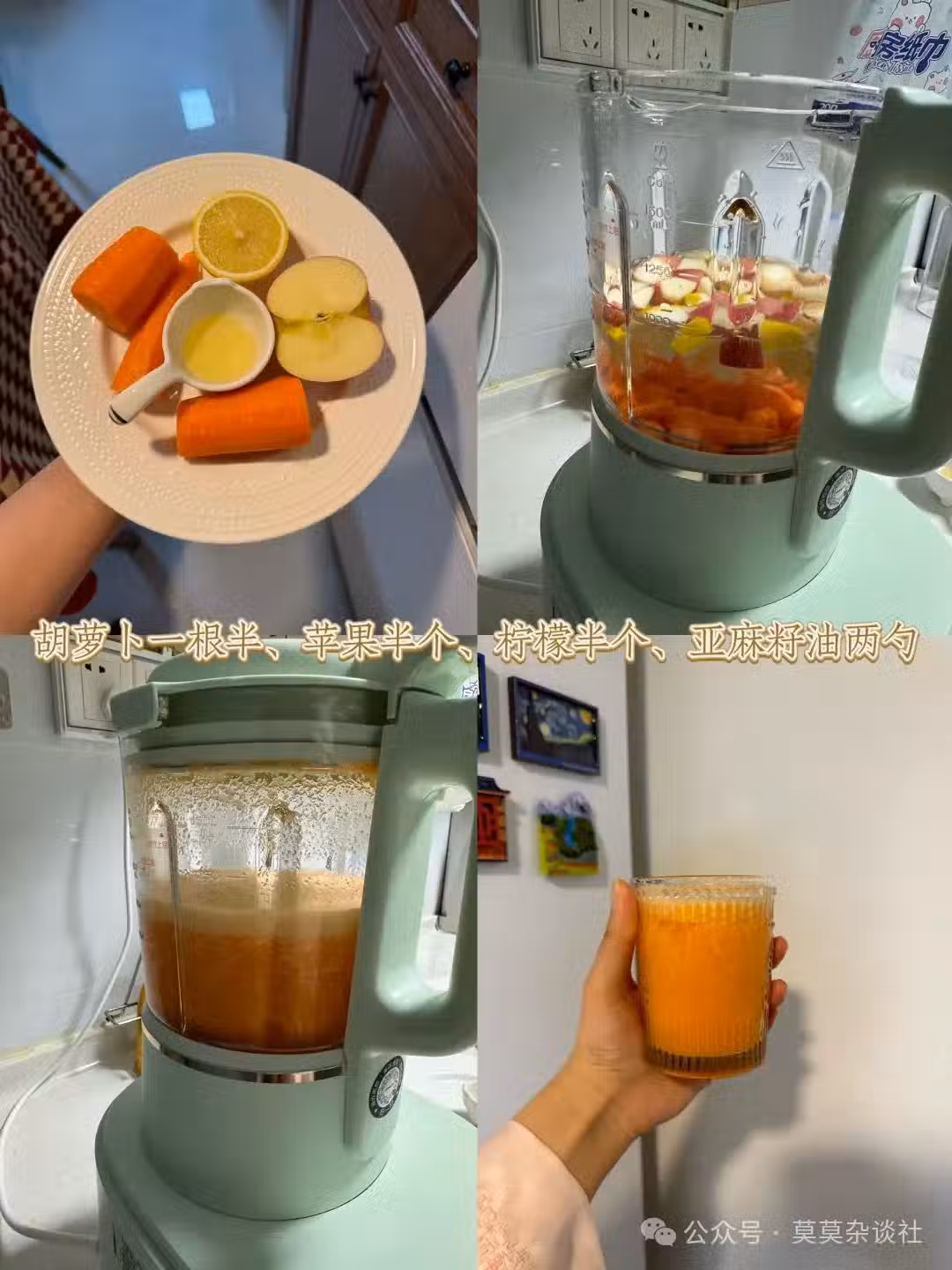 這款抗炎飲效果絕對驚艷,胡蘿蔔富含β胡蘿蔔素,蘋果和檸檬能幫助清理體內垃圾,亞麻籽油則提供優質脂肪酸,修護肌膚屏障。就像給身體做了一次「大掃除」,不僅皮膚更加透亮,連腸胃也能輕鬆不少。