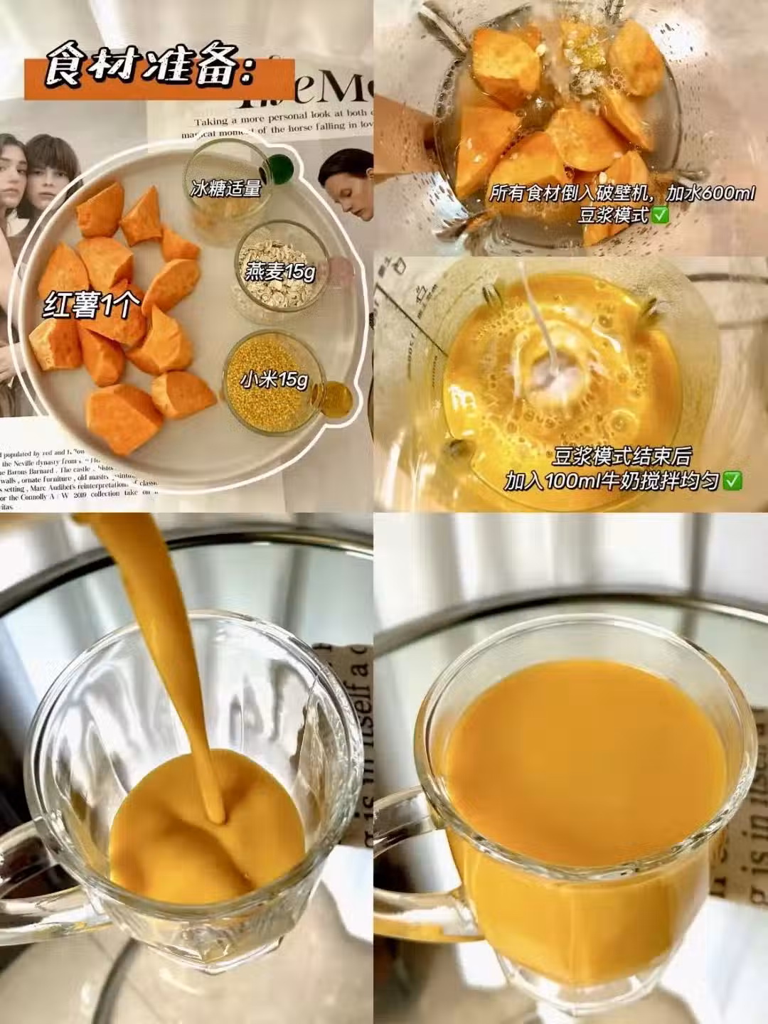 • 將紅薯、燕麥、小米放入破壁機,加入 600ml 水,選擇豆漿模式開始製作。