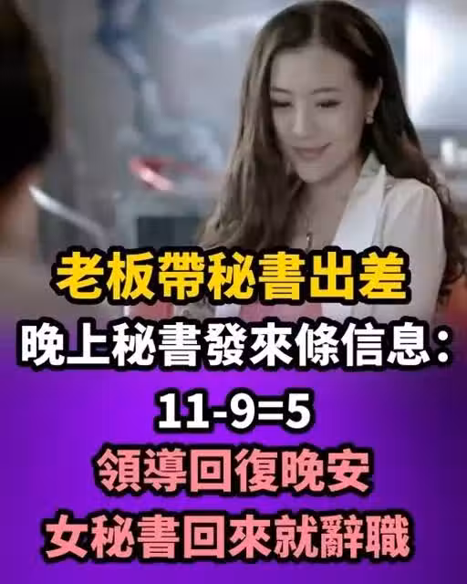 老闆帶秘書出差,晚上秘書發來條信息:11-9=5,領導回復晚安,女秘書回來就辭職