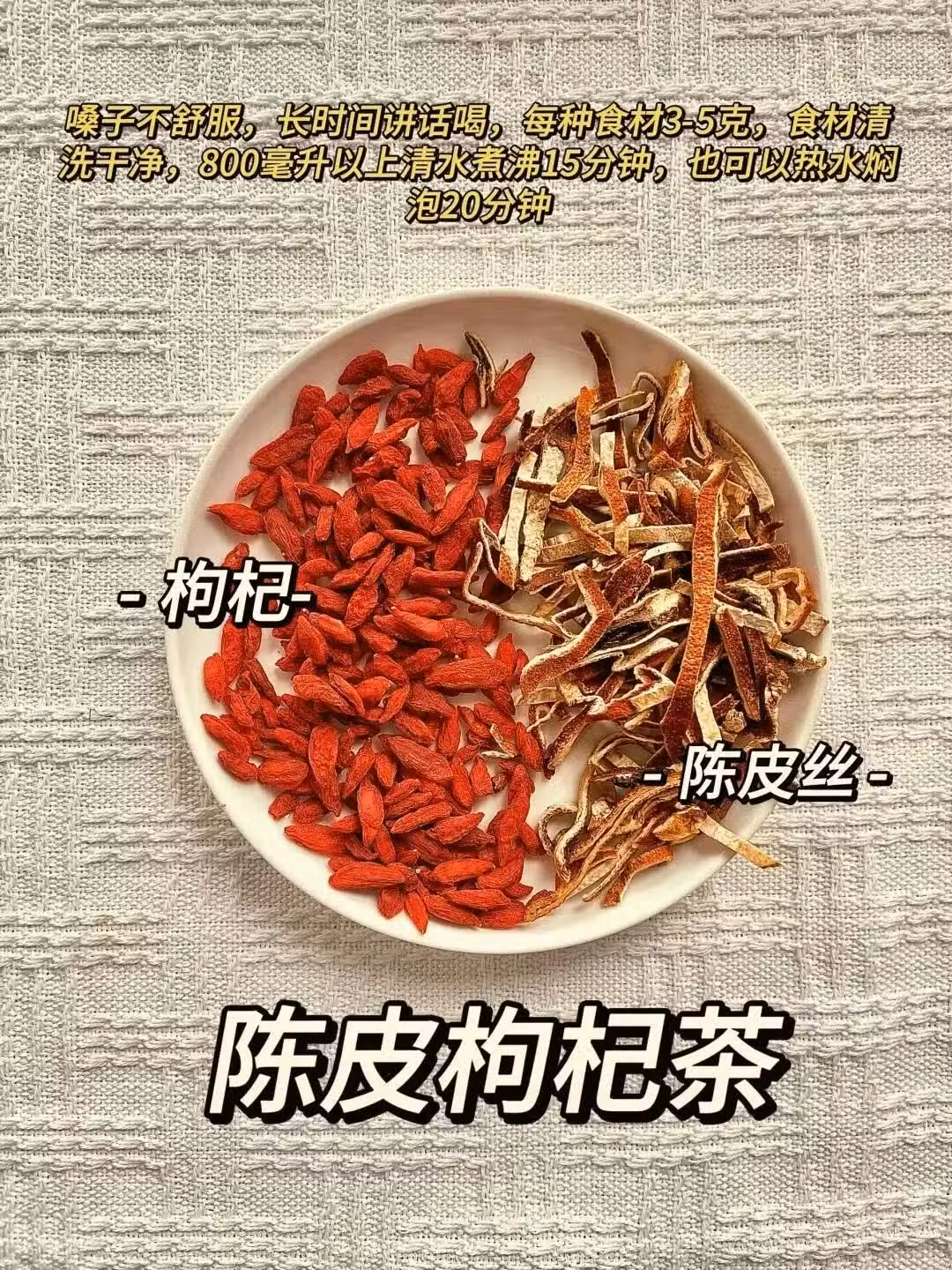 陳皮舒緩喉嚨,枸杞滋補肝腎、明目抗疲勞。
