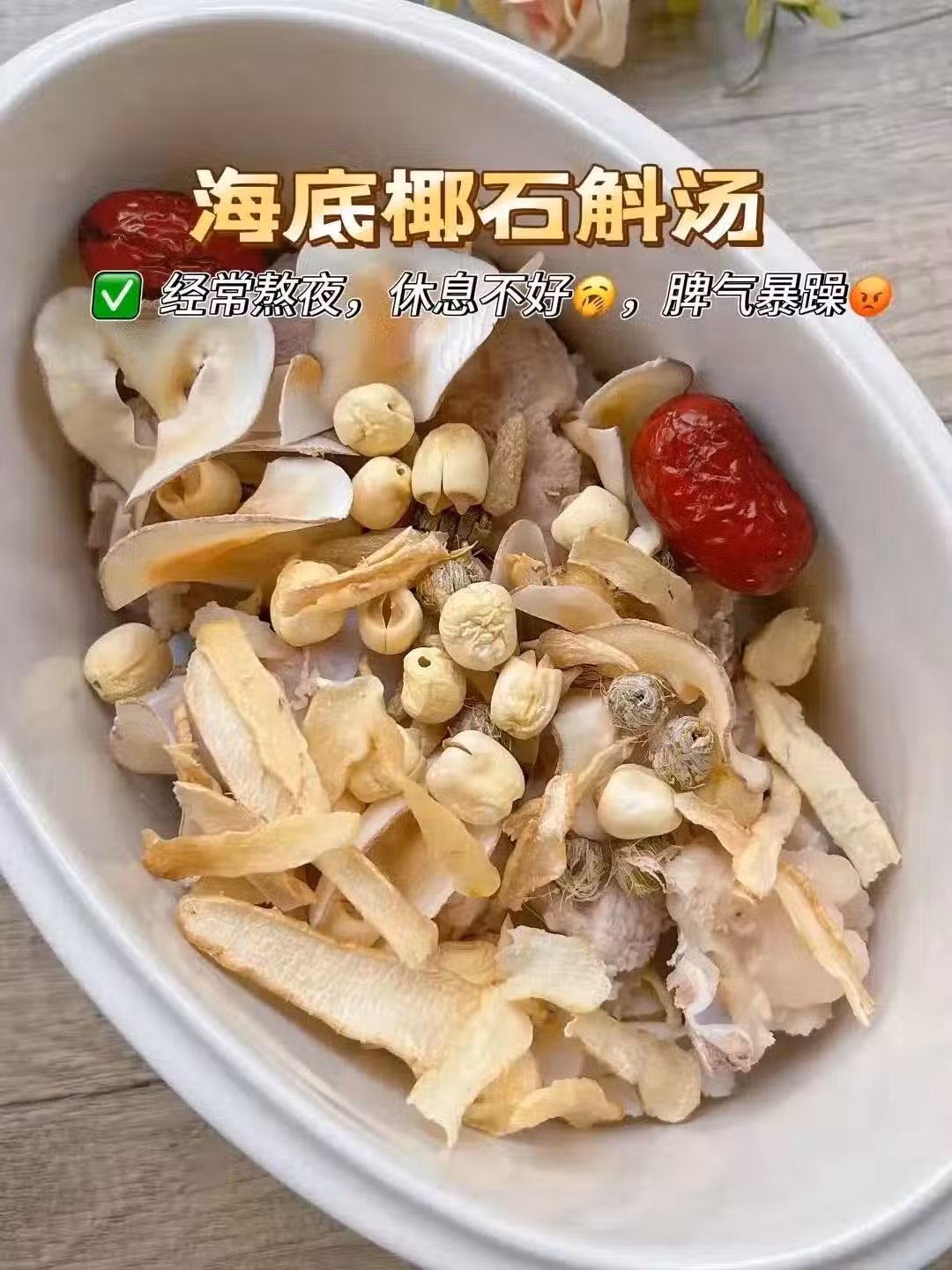 材料:海底椰,石斛,麥冬,蓮子,玉竹,紅棗。
