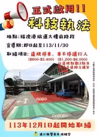 縣警局說明,福澳港旅運大樓周邊為地區公共運輸運輸主要樞紐,每日配合船班為海運最繁忙時刻,致大樓前路段車流、人流亦隨之增加,進而影響港區周邊交通安全。為改善停車亂象,決定設置科技執法,取締項目包括違規停車、車輛未停讓行人;至去年11月30日前之3個月為宣導期,12月1日起正式實施科技執法取締。