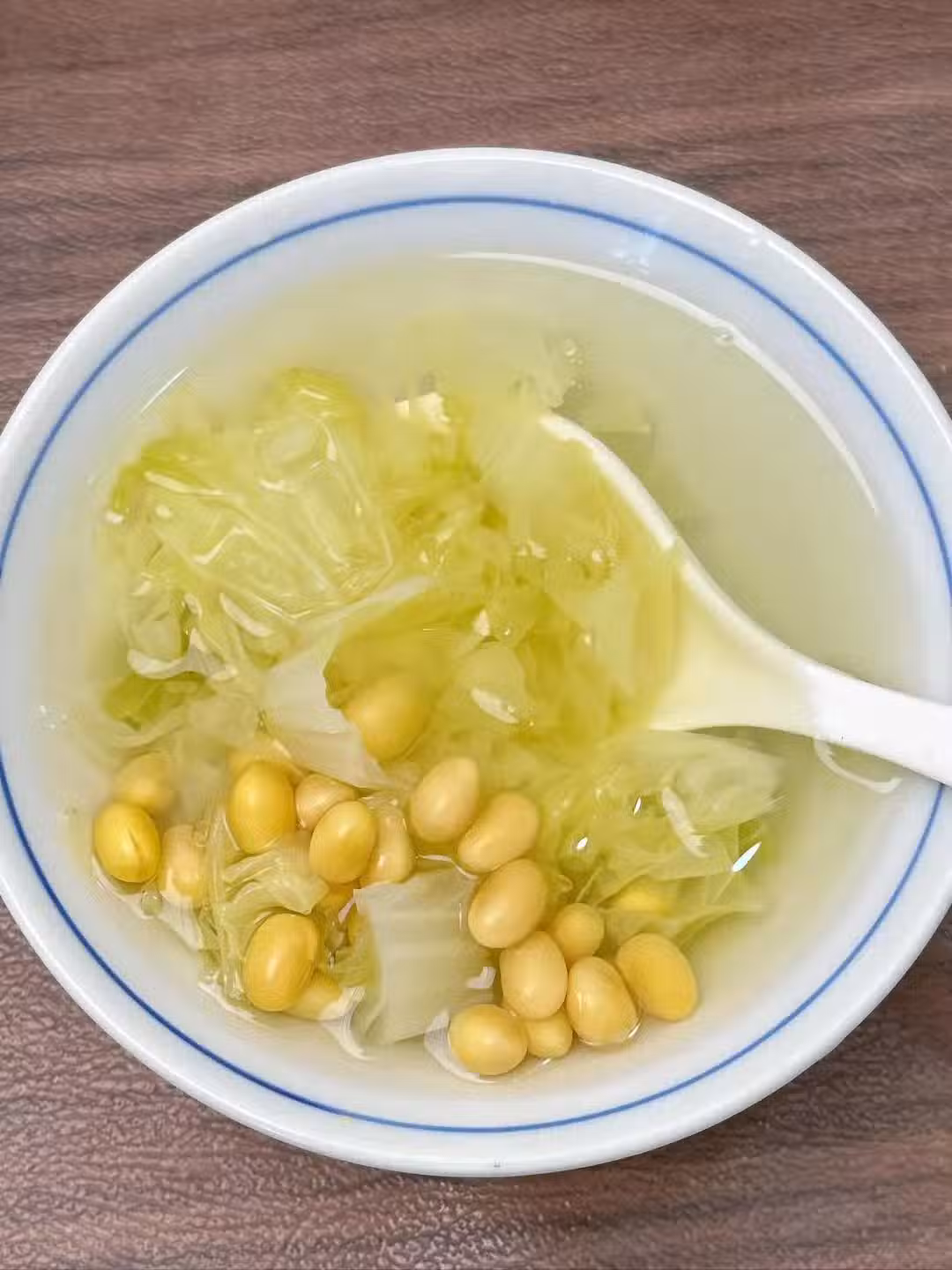 1、黃豆提前泡一小時,加水煮 20分鐘後,加入白菜心,繼續煮10分鐘即可。