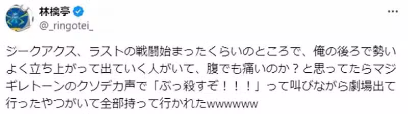 「我看《機動戰士Gundam GQuuuuuuX》看到哭的時候,有個大叔突然對著所有觀眾大喊:『信不信我殺了你!』然後離場,讓整個影廳瀰漫一股奇妙的緊張感了。」