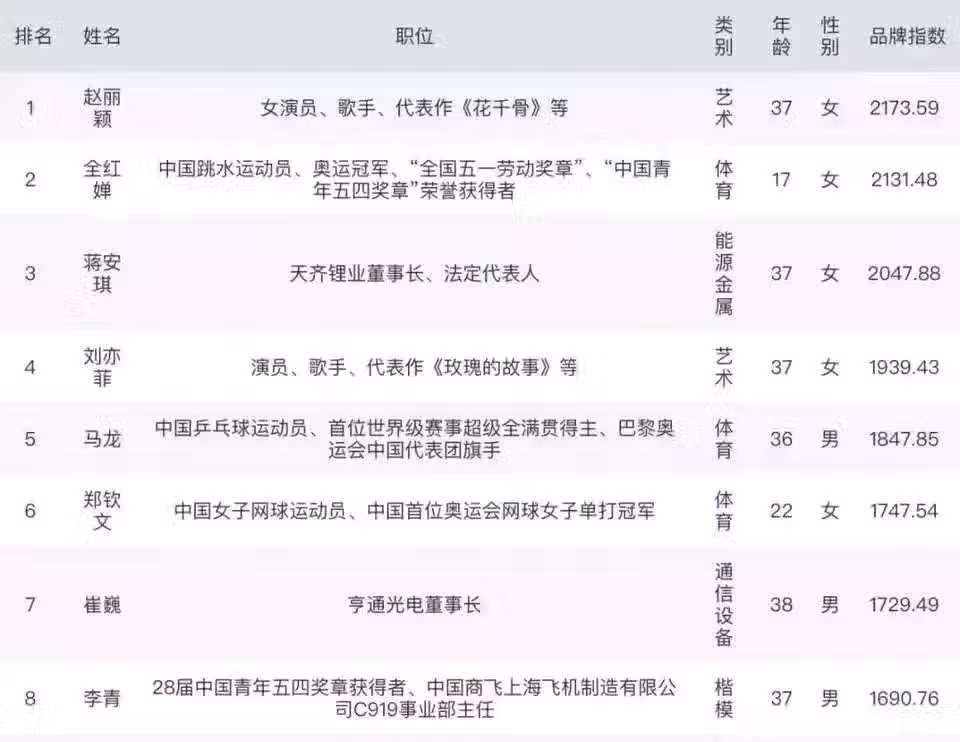 恭喜!全紅嬋上榜啦!青年五百強,趙麗穎第一,全紅嬋第二**