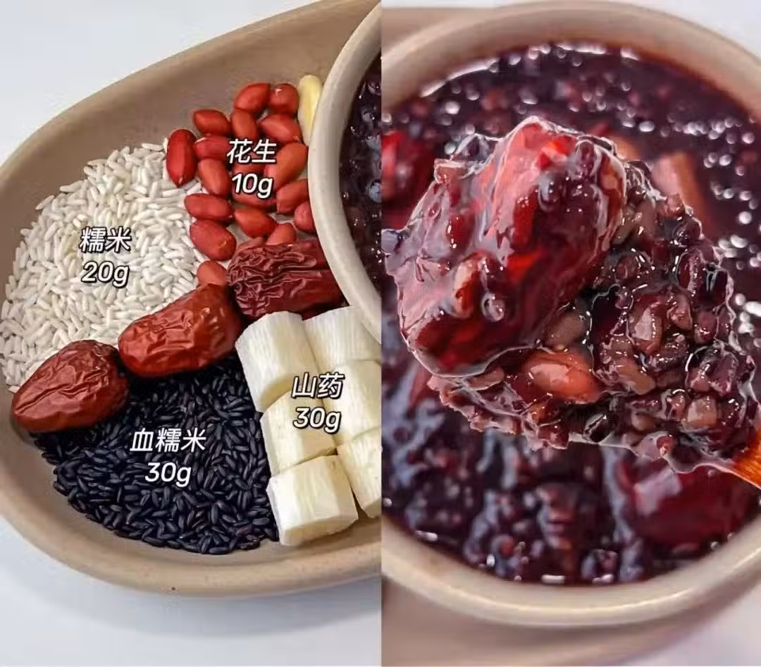 食材:紅棗去核3個|山藥30g|血糯米30g|糯米20g|花生10g