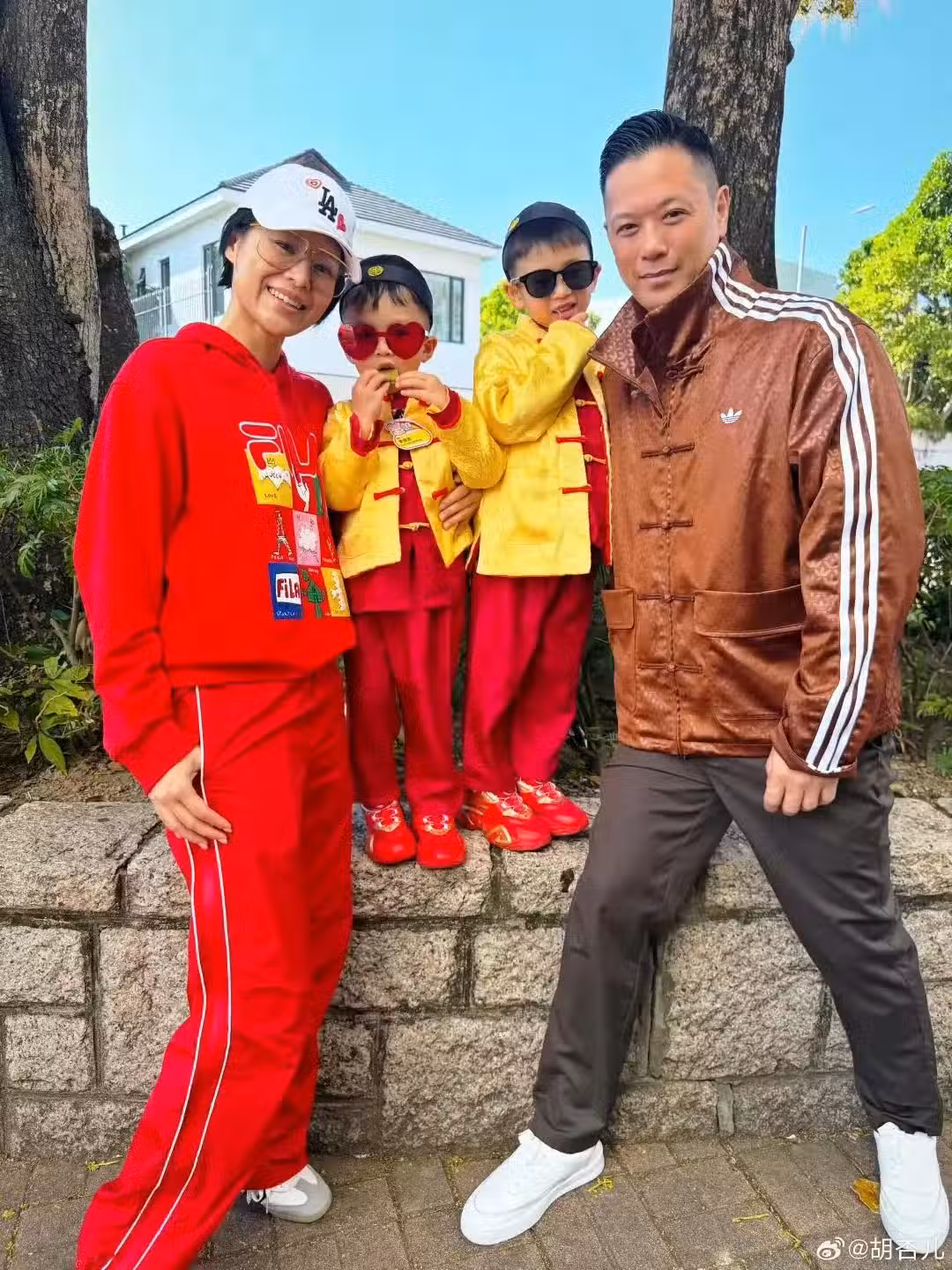 胡杏兒一家五口迎新年,三個兒子穿唐裝帥氣可愛,模樣似複製粘貼